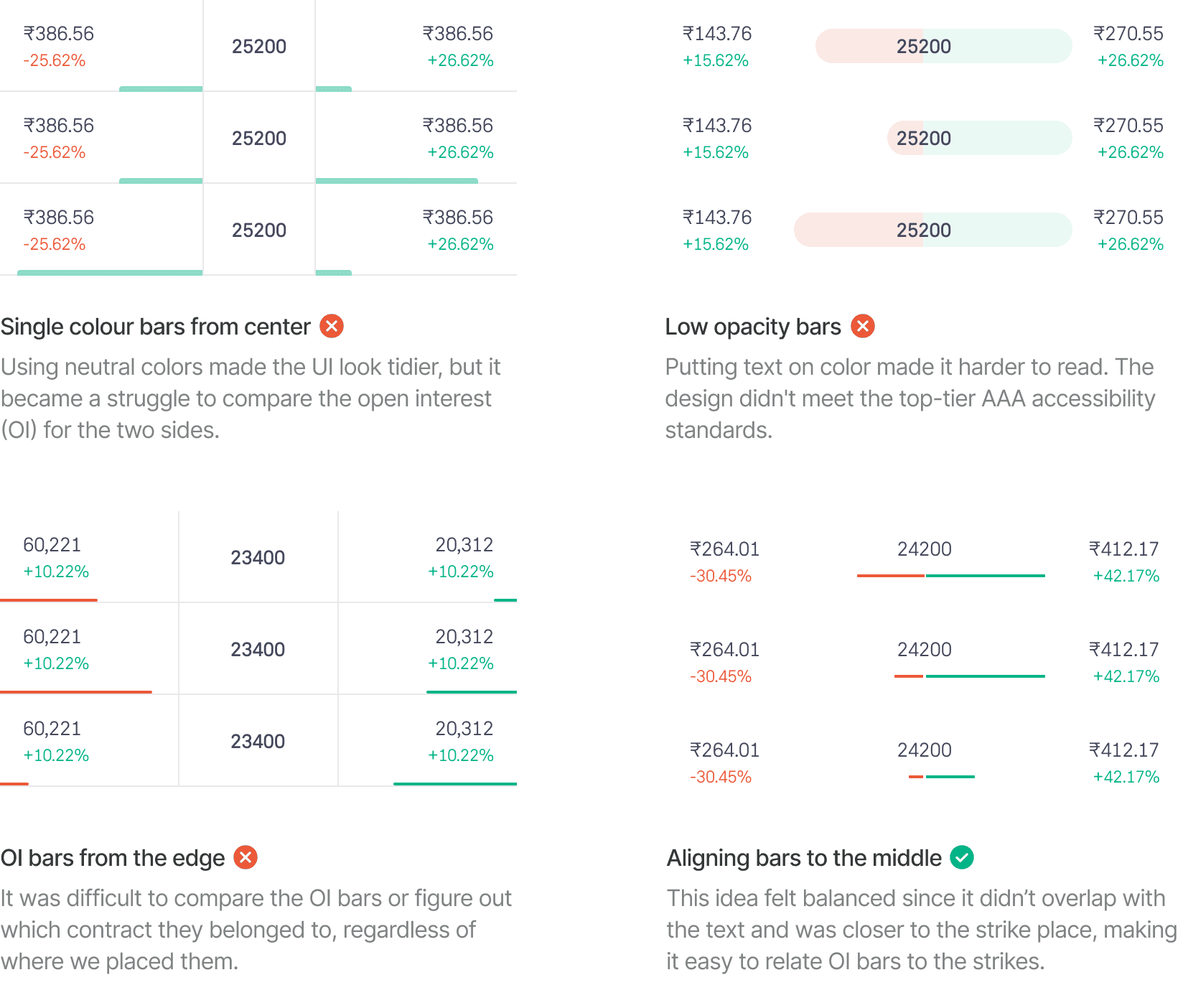 While solving for toggling problem we realized that traders didn’t need the exact OI number. They just needed to quickly spot which strikes had the highest OI, so they could find key support or resistance levels. Instead of showing a complicated table view with lots of numbers we chose to simplify and visualize open interest.